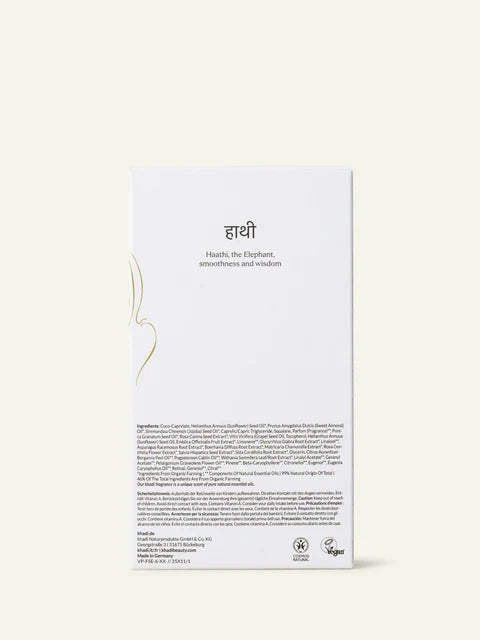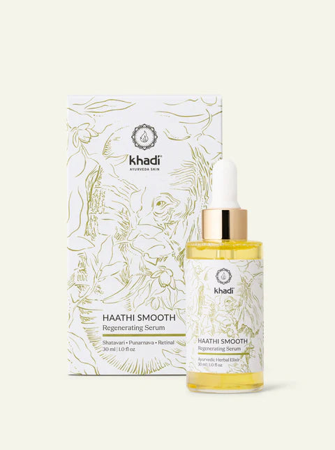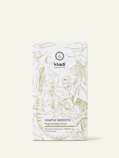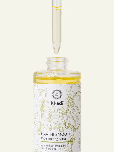 Siero khadi Haathi Smooth è un siero viso Ayurvedico che aiuta la pelle a rigenerarsi profondamente, migliorandone visibilmente l’aspetto e donandole una morbidezza immediata. Ideale per pelli secche, mature o stressate. Unisce la forza silenziosa dell’Elefante – Haathi in sanscrito – con le conoscenze della moderna ricerca dermatologica e la tradizione millenaria dell’Ayurveda.