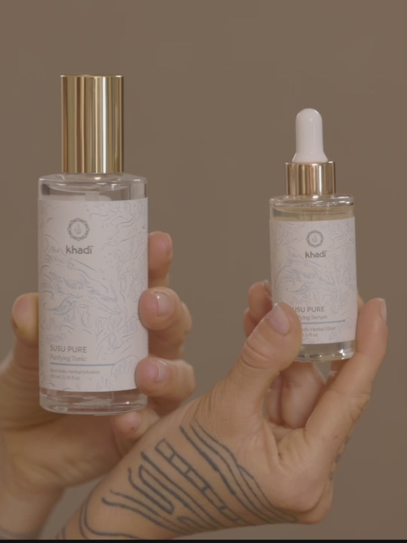 Susu Pure unisce la Skincare Science alla potenza dell’Ayurveda. Un delicato complesso a base di acido salicilico libera i pori ostruiti, rimuove le cellule morte e regola la produzione di sebo – per una pelle subito più uniforme e levigata. Allo stesso tempo, l’Elisir khadi a effetto profondo sprigiona la sua azione riequilibrante, lenitiva e rigenerante. La pelle non viene solo purificata in superficie, ma riportata in equilibrio in modo completo e profondo.