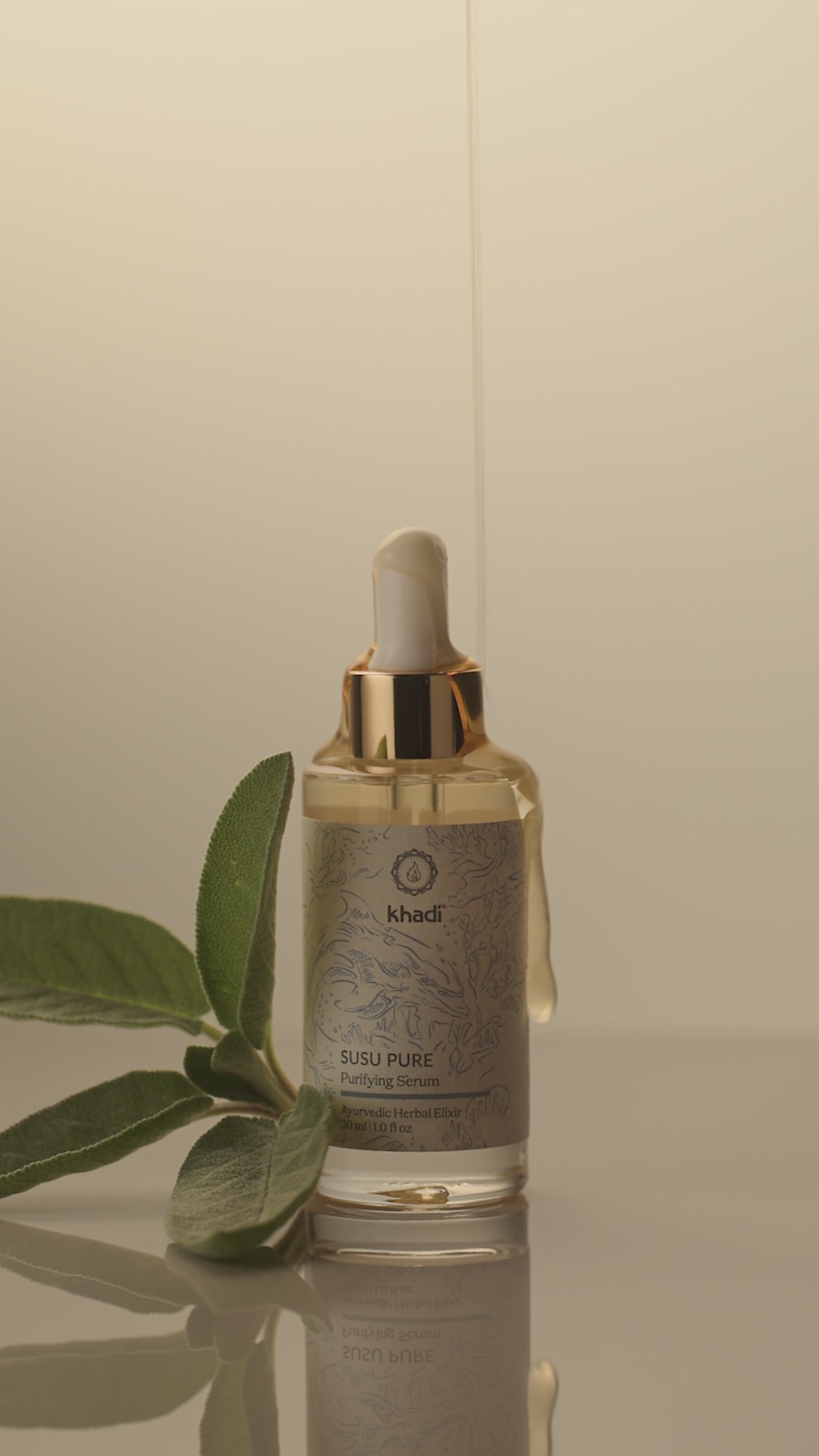 Il cuore del Siero khadi Susu Pure è il prezioso Elisir Susu – un estratto Ayurvedico altamente potente, ottenuto da erbe officinali secondo un processo di lavorazione tradizionale lento e a bassa temperatura. In questo modo, le piante indiane si combinano sprigionando tutto il loro potenziale. Lemongrass, Coriandolo e Nagarmotha favoriscono l’azione detox, mentre Manjistha e Kapurkachari rigenerano la pelle e contrastano lo stress ossidativo. L’Elisir ha un effetto riequilibrante, antibatterico e purificante in profondità – riportando delicatamente la pelle infiammata, oleosa o impura al suo equilibrio naturale. Lenisce le irritazioni, riduce le impurità e rafforza la barriera cutanea in modo duraturo.
