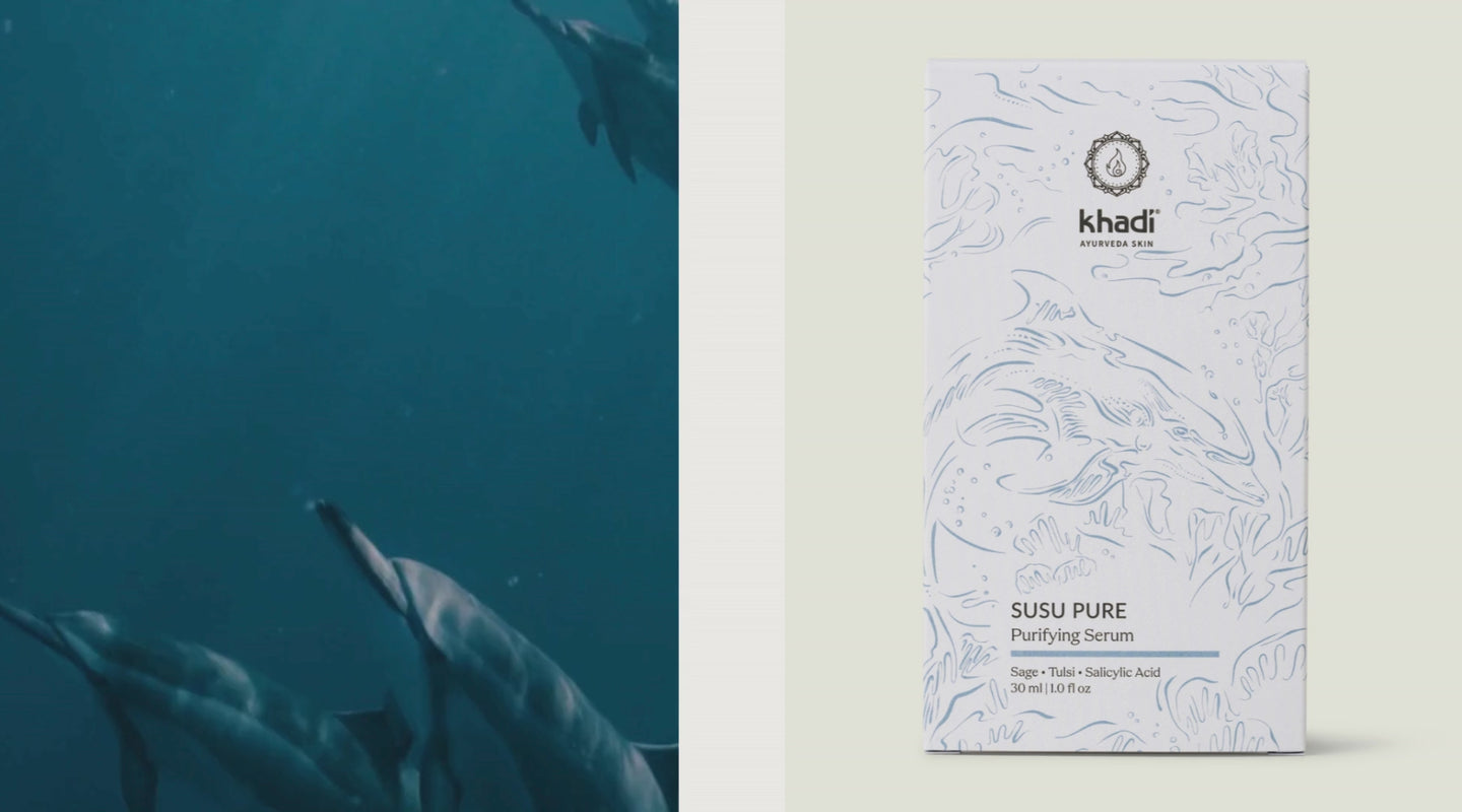 Come il Delfino – Susu in sanscrito – scivola con leggerezza nell’acqua, il Siero Ayurvedico khadi Susu Pure riporta delicatamente la tua pelle al suo equilibrio naturale.