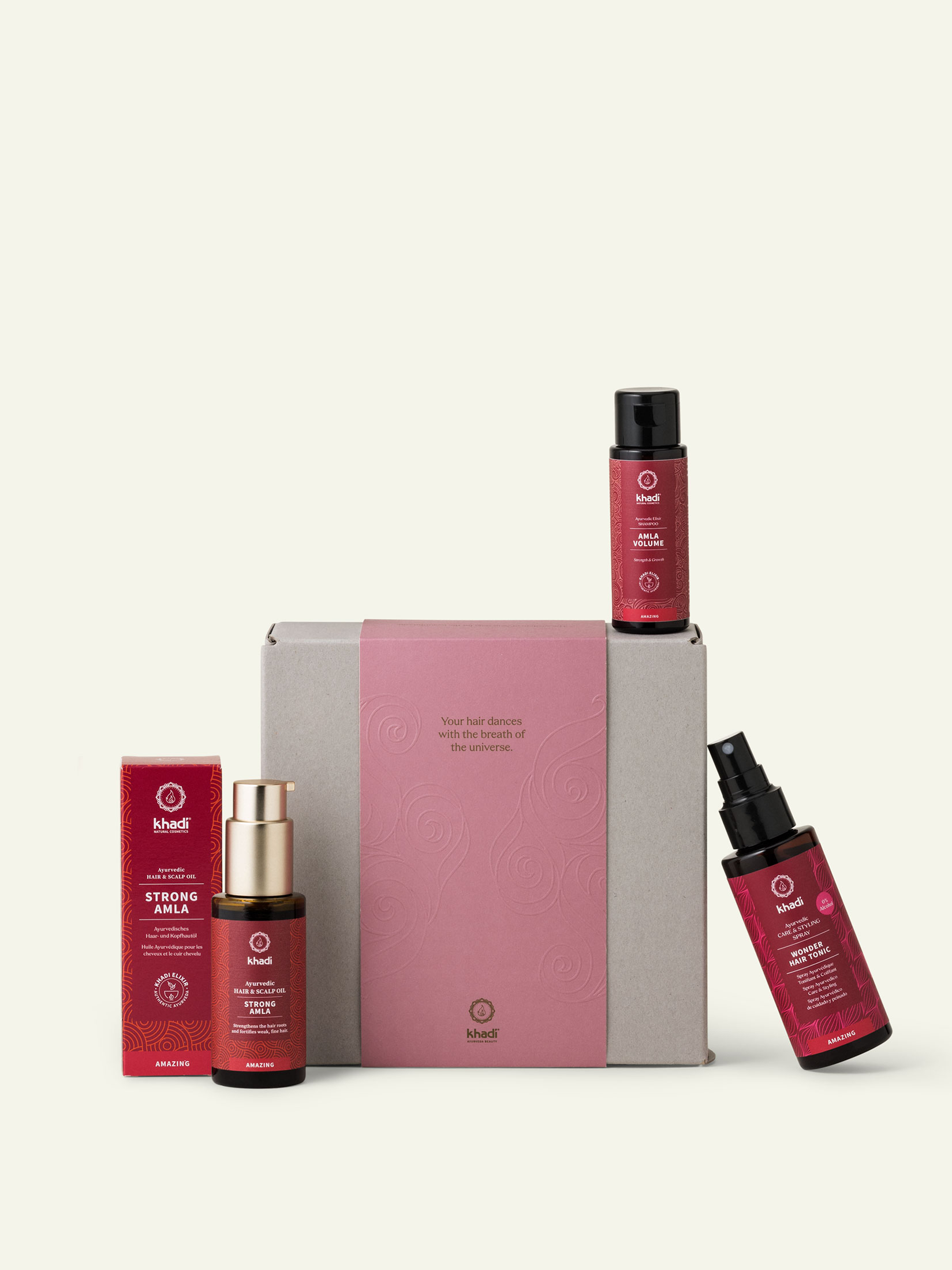 Questo set khadi dedicato alla bellezza dei capelli della linea bestseller Amla è pensato per chi ama capelli voluminosi, pieni e forti. Un regalo confezionato con cura, impreziosito dall’illustrazione dell’artista Nikita Fabbro, che trasmette gioia di vivere e vitalità. Secondo la tradizione Ayurvedica, la potente formula Amla dona forza ai capelli: radici più solide, chioma rivitalizzata e volume pieno di energia. Con ingredienti puri, scelti con cura e lavorati con amore.