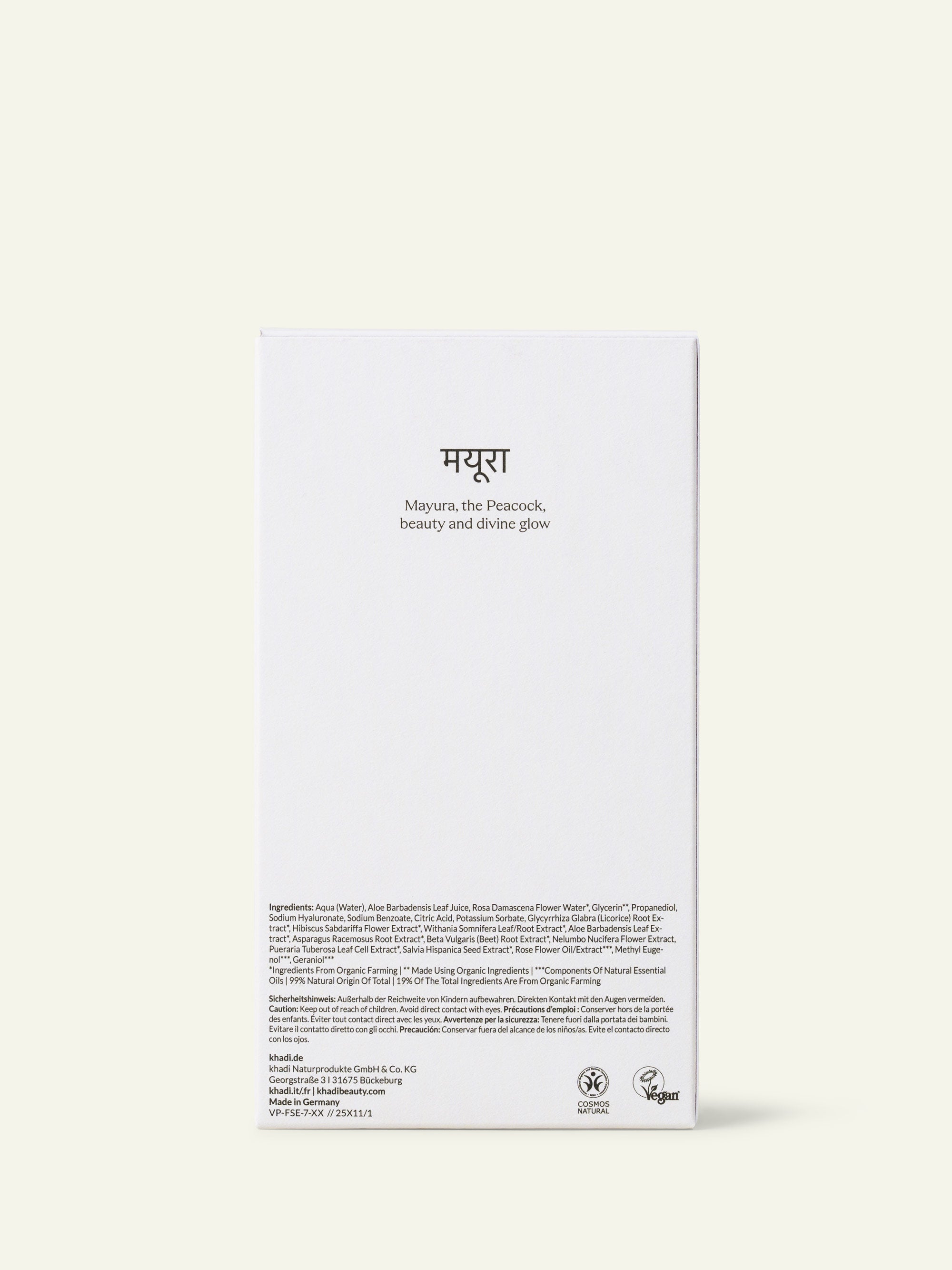Wie alle khadi Produkte sind auch das Mayura Glow Tonic und Serum 100% natürlich, vegan und frei von synthetischen Zusätzen. Für alle Hauttypen geeignet, besonders für fahle, müde oder strapazierte Haut, die wieder Energie und Leuchtkraft braucht.
